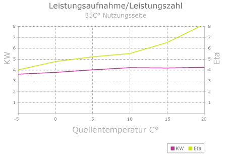 Das Diagramm zeigt den Verlauf der Leistungszahl und der Leistungsaufnahme einer Wärmepumpe in Abhängigkeit zur Quellentemperatur.