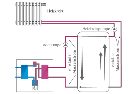 Da der Puffer "innen offen" ist, durchmischen sich die Wasser beider Kreisläufe, ohne sich gegenseitigen zu beeinträchtigen.